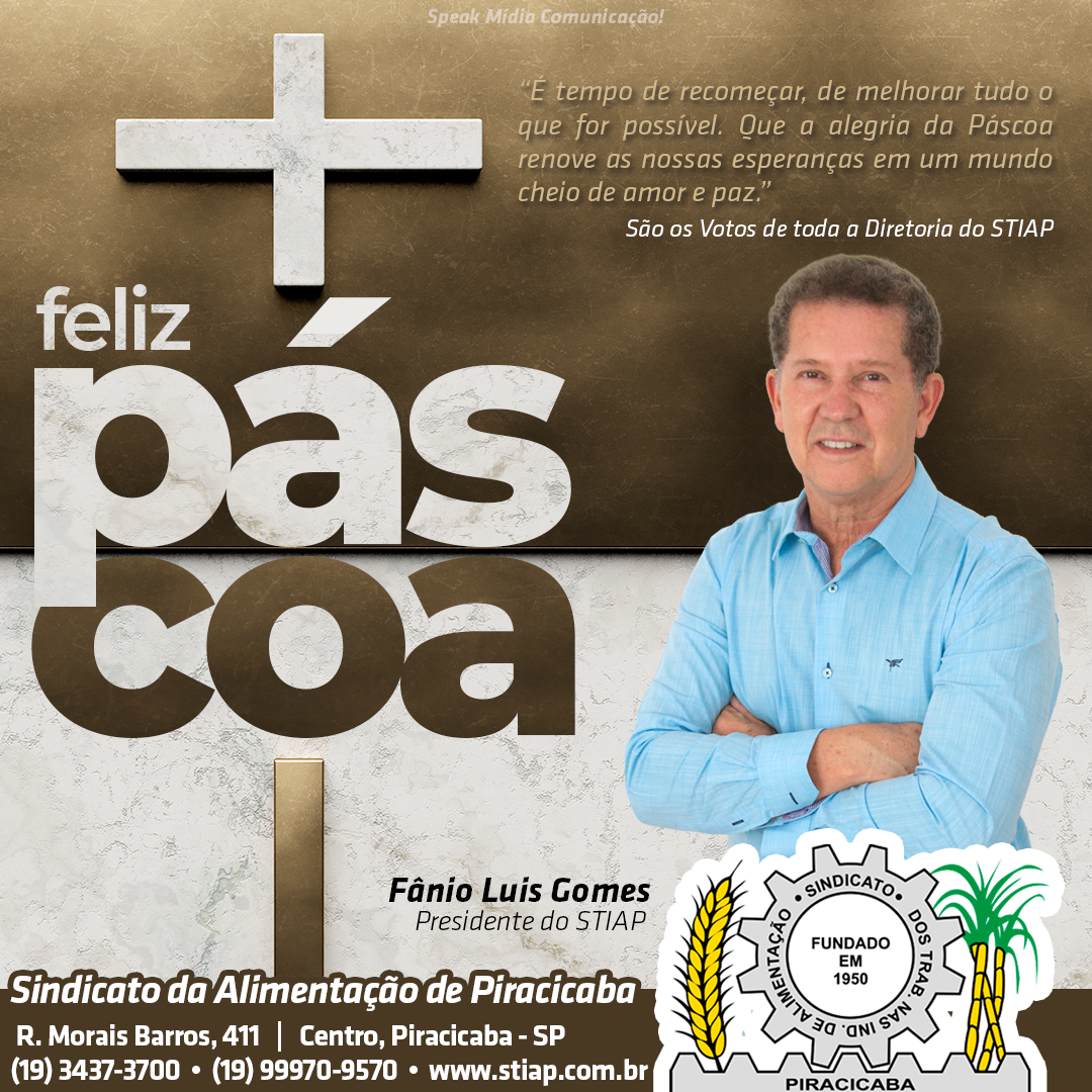 Fotos Feliz Páscoa 17 de abril de 202213 de agosto de 2022 Speak Midia “É tempo de recomeçar, de melhorar tudo o que for possível. Que a alegria da Páscoa renove as nossas esperanças em um mundo cheio de amor e paz.” Desejamos a todos uma Feliz Páscoa! São os Votos de toda a Diretoria do STIAP