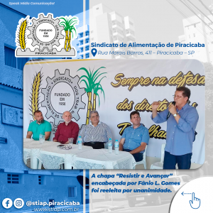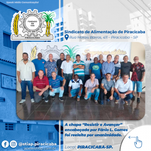 Em assembleia, no final da tarde de quarta-feira, 07 de dezembro, foi eleita por unanimidade a nova diretoria do Sindicato dos Trabalhadores nas Indústrias de Alimentação de Piracicaba, que tem como Presidente Fânio Luis Gomes, reeleito para o cargo. A chapa “Resistir e Avançar”, encabeçada por Fânio Luis Gomes, foi a única a se inscrever para participar do processo e toma posse no dia dois de março do próximo ano.