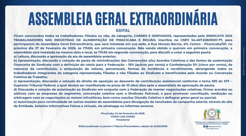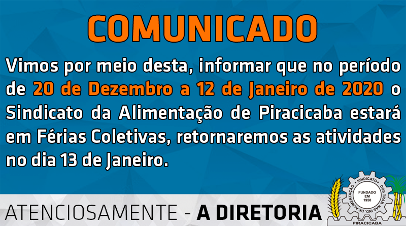 Trabalhador Associado do Sindicato da Alimentação de Piracicaba, informamos que segunda-feira 13/01/2020 retornaremos nossas atividades normais de Trabalho!